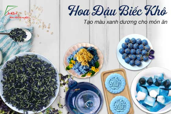 Hoa đậu biếc cho màu xanh nước biển tự nhiên, không sử dụng chất bảo quản hay chất tạo màu và cho màu bền khi sử dụng nhiệt. Hoa đậu biếc được sử dụng để tạo màu cho các món ăn như bánh, xôi, thạch, trân châu, mứt, làm trà hoa,….